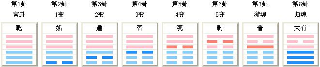 | 宫卦 | 第一变 | 第二变 | 第三变 | 第四变 | 第五变 | 游魂卦 | 归魂卦 |