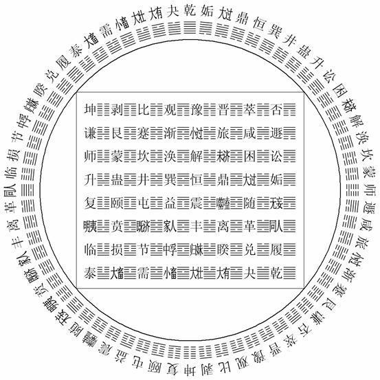 下面我们再看圆图,圆图也分为八个组,第一组是从上面的“乾”开始按逆时针方向的八个卦,与方图的最下面一横排相同,紧接着第二组从“履”到“临”与方图的倒数第二横排相同。第三组从“同人”到“明夷”,第四组从“无妄”到“复”。请注意,第五组要回到“乾”的位置按顺时针方向数,即从“姤”到“升”,第六组为从“讼”到“师”,第七组从“遁”到“谦”,第八级从“否”到“坤”。