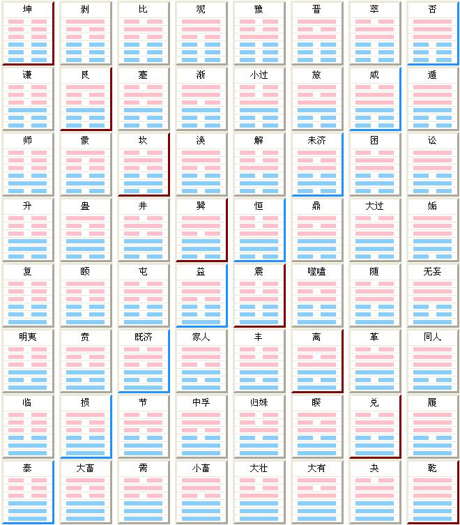 下面再看下起倒数第二横排,也是八个卦,这八个卦的上经卦与刚才一样,而下经卦全部为“兑”。以此类推可以看出,第一横排的八个上经卦都是一样的规律,而下经卦的规律是从下往上按先天数排列。