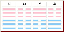 这一组共四个别卦,“乾为天”、“坤为地”、“天地否”、“地天泰”,是其它卦的父母卦,天地未交之时为“天地否”,天地既交之后为“地天泰”。