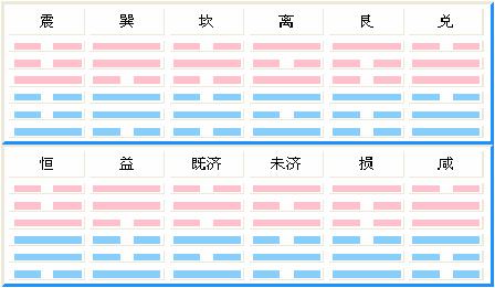 | 完全相同 | 仅下爻不同 | 仅上爻相同 | 完全相错 | 仅下爻相同 | 仅上爻不同 | 仅中爻相同 | 仅中爻不同 |