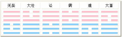 夫妇交亲而生男女,男子从父之道而治世于前,所以这一组为三男与父相从,共六卦,从父前为“天雷无妄”、“天水讼”、“天山遁”,从父之后为“雷天大壮”、“水天需”、“山天大畜”。