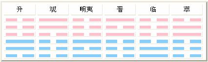 夫妇交亲而生男女,女子从母之道而理事于后,所以这一组为三女与母相从,共六卦,从母前为“地风升”、“地火明夷”、“地泽临”,从母之后为“风地观”、“火地晋”、“泽地萃”。