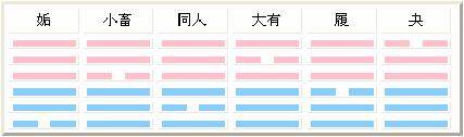 乾为纯阳,得一阴而成女,女归于父为造化行天之意,这一组也是六卦,为三女从父。从父之前为“天风姤 ”、“天火同人”、“天泽履”,从父之后为“风天小畜”、“火天大有”、“泽天夬”。