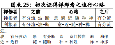 当最后一个欲界微小速行心路灭去之后,心流落入有分。随后生起一个意门转向心,把心转向于似相;意门转向心灭去后,生起一个遍作心。“遍作”(parikamma)是准备,即准备让心流证入禅那。遍作心灭去后,生起一个近行心(upacàra),即已走近禅那。近行灭去后,生起一个随顺心(anuloma),既随顺之前的欲界心,又随顺之后的禅那心。随顺心灭去后,生起一个种姓心(gotrabh?),改变欲界种姓而步入色界。改变种姓后,心就不会只在欲界中打转,开始有能力上进到色界。种姓心灭去后,生起一个禅那心。如果是初禅,这个心是初禅禅心。