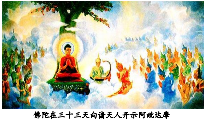 佛陀在证悟正觉后的第七个雨安居到了三十三天界,坐在 珊瑚 树 (Pà ricchattaka) 下 的 黄色 石座 (Pa?ó ukambalasilà sana)上,用[相当于人间]3 个月的时间, 向来自一万个轮围世界的诸天人及梵天人开示阿毗达摩,当时主要的听众是佛陀已经去世并投生到喜足天(Tusita) 的母亲马哈马雅(Mahà mà yà )。他那时已经不是女人了,而是一位男性天子。