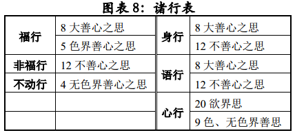 心行的范围最广泛,包括二十种欲界思(八大善心、十二不善心)和九种色、无色界善思(五种色界善思、四种无色界善思)。造业不外乎是由这些心执行的,没有证得禅那者所造的只是八大善心和十二不善心的业。