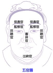 公笃曰。五官者。言其贵也。故以官名之。而分区段之要害故也。眉为保寿官。以长秀柔润为合格。主名高寿永。清廉出之。保寿官居其上者。五福一曰寿之义也。目为监察官。以长收晶清为合格。主职贵权重。刚毅出之。监察官居其次者。立身之本也。鼻为审辨官。以丰隆圆耸为合格。主富厚多财。礼义出之。审辨官居其三者。财政重地也。口为出纳官。以匀厚朱仰为合格。主寿长禄重。孝弟出之。出纳官居其四者。一生之衣禄也。耳为采听官。以长大厚珠为合格。主聪明贵福。忠信出之。采听官居其旁者。乐善之机也。