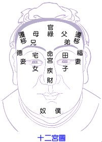 十二.法令为井灶侧之长纹。又名寿带。两法令纹入口。又名滕蛇。退一指陷处。即两陂池。其次则名金缕。又其次则名虎耳。虎耳在命门前一指。即医家之听宫穴也。归来则在虎耳金缕之间。前三部略短。后二部略宽。