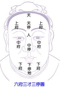 二.发际之下为天中。其次为南岳。又名火星。又其次为天庭。又其次为司空。又其次为中正。中正一名华盖。而气色部位。则以华盖包括司空中正两部。两眉之中。方为印堂。印堂者。君位也。此为全面部之主。由天中至印堂。共六个部位。勿论高低。匀分六部可也。