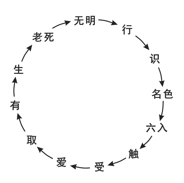 (十二因缘:无明、行、识、名色、六入、触、受、爱、取、有、生、老死)
