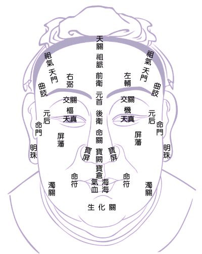 十七.两颧骨原名国印。又名东西岳。内属三焦之连带系。古人则谓三焦有名无质。不过分上中下之义耳。果如此说。何不谓上段中段下段。又何得以三焦。名之耶。余考新法。及解剖学。谓脏腑中有连网油一物。上补正气之不足。下逐浊秽之有余。其关系之重要。与古人之论三焦相等。大体三焦。即连网油之别名。唐宗海证实为三焦也。而在大小肠之上。曲折以掩护各脏也。其地位以高耸上插为权重。而贵名之事业非常。即国家之屏藩也。以抵小陷弱。主平常而不贵。其才智能为皆不足也。如隆大而地位不近目尾。此为假权。多应优伶界中人也。如泪堂下插而破颧骨主患神经病而减智识。此地如有黄紫明润之气色。主进权禄而升迁。获功进职也。如有青浮滑腻之气色。主謪贬去权。忧愁惊恐。常人亦主障碍损失。冷退破财。如有黑赤红滞之气色。主危险死亡。牢狱枷锁。轻亦主孝服刑伤。大破败之惊恐也。如红绦浮光。则为酒湿痣漏之病。如红艳浮光。则为情欲劳伤之疾。原名国印。今更名曰屏藩。即为国家屏藩重镇而名之也。