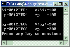 #include<stdio.h>intmain(void) {inti = 100, j=200;int*p; p = &i; //变量i的地址赋给p printf("&i=%p *(&i)=%d\n", &i, *(&i)); printf(" p=%p *p =%d\n\n", p, *p); p = &j; //变量j的地址赋给p printf("&j=%p *(&j)=%d\n", &j, *(&j)); printf(" p=%p *p =%d\n", p, *p);return0; }