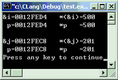 #include<stdio.h>intmain(void) {inti = 100, j=200;int*p; p = &i; //变量i的地址赋给p *p = 500; //将500赋给p指针 //变量i的内容也随之改变为500 printf("&i=%p *(&i)=%d\n", &i, *(&i)); printf(" p=%p *p =%d\n\n", p, *p); p = &j; //变量j的地址赋给p j++; //将p指针的内容+1 //指针*p的内容也随之改变201 printf("&j=%p *(&j)=%d\n", &j, *(&j)); printf(" p=%p *p =%d\n", p, *p);return0; }