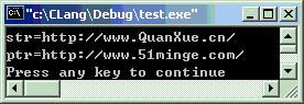 char *ptr = "http://www.51minge.com/";中赋值的性质和上面的str不同。这并不是将"http://www.51minge.com/"赋给*ptr指针,而是先定义一个常量"http://www.51minge.com/",这个常量是定义在“栈”里面,然后将这个常量的地址赋给ptr,而不是*ptr。常量是不能被修改的,因此ptr[13]也就出错了。这是初学者经常犯的错误。