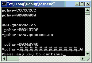 #include<stdio.h>#include<stdlib.h>intmain(void) {char*pchar; //下面这句出错,忽略之后继续 printf("pchar=%p\n", pchar); //未分配的指针不可用 pchar = NULL; printf("pchar=%p\n\n", pchar); //空指针可用于表达式中 //pchar为空时,动态分配内存if(!pchar) { pchar = (char*)malloc(20); //动态分配内存if(!pchar) { //初学者不要忘记, 这是必要的判断 printf("内存分配失败。"); exit(-1); //退出 } gets(pchar); printf(" pchar=%p\n*pchar=%s\n", pchar, pchar); free(pchar); //内存释放后,指针变量的地址不变if(pchar) { //pchar并不为空 printf("\n pchar=%p\n*pchar=%s\n", pchar, pchar); //pchar成了“野指针” } }return0; }