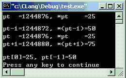 #include<stdio.h>intmain(void) {intnum[] = {50, 25, 75, 100};int*pt; pt = num + 1; //故意将第2个元素地址赋给指针变量 //显示指针变量所指的地址以及指针的值 printf("pt =%d, *pt =%d\n\n", pt, *pt); //当指针变量减1或加1时,所指的地址并不减1或加1,而是加减4,因为int是4个字节 printf("pt-1=%d, *(pt-1)=%d\n", pt-1, *(pt-1)); printf("pt =%d, *pt =%d\n", pt, *pt); printf("pt+1=%d, *(pt+1)=%d\n", pt+1, *(pt+1)); //显示pt当作数组用时的值。(注意:[-1]仍然是正确的) printf("\npt[0]=%d, pt[-1]=%d\n", pt[0], pt[-1]);return0; }