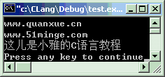 #include<stdio.h>intmain(void) {char*message[] = {"www.quanxue.cn", "www.51minge.com", "这儿是小雅的C语言教程"};char**p; //指向指针的指针inti; p = message; //指向指针的指针赋初值for(i=0; i<3; i++) { printf("%s\n", p[i]); }return0; }
