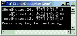 #include<stdio.h>intmain(void) {char*msg[] = {"www.quanxue.cn", "www.51minge.com", "这儿是小雅的C语言教程"};doubledNum[] = {12.5, 24.55, 100.83};double*p = dNum; printf("dNum的size:%2d, 数组个数是:%d\n",sizeof(dNum), (int)sizeof(dNum)/sizeof(double)); printf(" p的size:%2d, 数组个数是:%d\n",sizeof(p ), (int)sizeof(p )/sizeof(double)); printf(" msg的size:%2d, 数组个数是:%d\n",sizeof(msg ), (int)sizeof(msg )/sizeof(char*));return0; }
