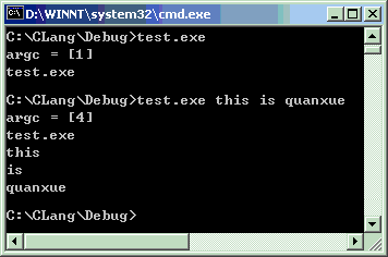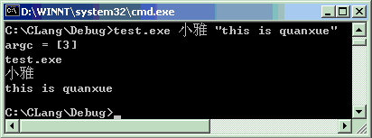 上例中“this is quanxue”本来想作为一个字符串输出,结果却变成3个,连同test.exe共4个了。解决带有空格的字符串是用双引号,例如要带参数“小雅”和“this is quanxue”。