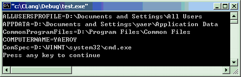 在第一章介绍main()函数时,省略了第三种定义,并非小雅当时还不知道,而是认为实在没有必要,因为标准函数库里面已经有了getenv()函数,简单方便地取任何环境变量的值,也许这第三种定义还有小雅不知道的好处吧。至于getenv()函数这儿不讲,以后在标准函数库中讲解。