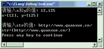 #include<stdio.h>intmain(void) {intx, y ;charstr[128]; //确保足够的空间 //输入整数x和y的值printf("请输入x和y的值: "); scanf("%d,%d", &x, &y); printf("x=[%d], y=[%d]\n\n", x, y); //输入字符串str的值 printf("请输入str的值: "); scanf("%s", str); printf("str=[%s]\n", str);