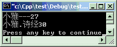 #include<iostream>#include<string>using namespacestd;classstuff { string name;intage;public: stuff(string n,inta):name(n),age(a) { cout << name << "---" << age << endl; } string getName() {returnname; }intgetAge() {returnage; }voidoperator +(intx); //运算符重载的定义voidoperator +(string s); //运算符重载的定义 };voidstuff::operator +(intx) //运算符重载的实装 { age = age + x; }voidstuff::operator +(string s) //运算符重载的实装 { name = name + s; }intmain ( ) { stuff st2("小雅", 27); st2 + 3; //+运算 st2 + ".诗经"; //+运算 cout << st2.getName() << st2.getAge() << endl;return0; }