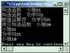 #include<iostream>#include<string>using namespacestd;classstuff { string name;intage;public: stuff(string n,inta):name(n),age(a) { cout << "构造函数 " << name << age << endl; } string getName() {returnname; }intgetAge() {returnage; } stuff&operator=(stuff& x); //赋值运算符重载 stuff(stuff& x):name(x.name),age(20) //拷贝构造函数重载 { cout << "拷贝构造函数 " << name << age << endl; } }; stuff& stuff::operator=(stuff& x) { age = x.age; cout << "赋值运算符 " << name << age << endl;return*this; }intmain ( ) { stuff st("小雅", 25); //调用通常的构造函数 stuff st1("劝学网", 2); //调用通常的构造函数 st1 = st; //因为不产生新的实例,所以调用的是赋值运算符 stuff st2 = st; //因为产生新的实例,所以调用的是拷贝构造函数 cout << st.getName() << st.getAge() << endl; cout << st1.getName() << st1.getAge() << endl; cout << st2.getName() << st2.getAge() << endl;return0; }