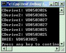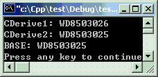 下面的例子是先定义一个“孙子”的实例,并将地址输出。再将这个实例的地址分别赋给CDerive1和CDerive2类型的指针变量,并输出指针地址。再将这2个地址分别赋给CBase的2个指针变量,并输出其地址。大家仍然不看结果,考虑一下答案应该是什么?