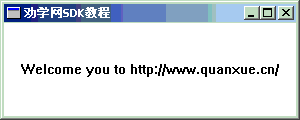 sizeof(wc)); wc.style = CS_HREDRAW | CS_VREDRAW; wc.lpfnWndProc = WndProc; wc.cbClsExtra = 0; wc.cbWndExtra = 0; wc.hInstance = hInst; wc.hIcon = LoadIcon(NULL, IDI_APPLICATION); wc.hCursor = LoadCursor(NULL, IDC_ARROW); wc.hbrBackground = (HBRUSH)GetStockObject(WHITE_BRUSH); wc.lpszMenuName = NULL; wc.lpszClassName = (LPCSTR)szClassName;return(RegisterClass(&wc)); } //初始化窗口类 BOOL InitInstance(HINSTANCE hInst, LPCSTR szClassName,intnCmdShow) { HWND hWnd; hWnd = CreateWindow(szClassName, "劝学网SDK教程", WS_OVERLAPPEDWINDOW, CW_USEDEFAULT, CW_USEDEFAULT, 400, 120, NULL, NULL, hInst, NULL);if(!hWnd)returnFALSE; ShowWindow(hWnd, nCmdShow); UpdateWindow(hWnd);returnTRUE; } LRESULT CALLBACK WndProc(HWND hWnd, UINT message, WPARAM wParam, LPARAM lParam) { PAINTSTRUCT ps; HDC hdc; TCHAR szHello[50]="Wecome you to Http://www.quanxue.cn/";switch(message) {caseWM_PAINT: //重画窗口消息 hdc = BeginPaint(hWnd, &ps); //开始描画 RECT rc; GetClientRect(hWnd, &rc); //取窗口有效区域 //显示文字(横向对中|不自动回行|纵向对中) DrawText(hdc, szHello, (int)strlen(szHello), &rc, DT_CENTER|DT_SINGLELINE|DT_VCENTER); EndPaint(hWnd, &ps); //结束描画break;caseWM_DESTROY: //关闭窗口消息 PostQuitMessage(0); //发送关闭消息break;default:returnDefWindowProc(hWnd, message, wParam, lParam); //缺省窗口消息处理函数 } return 0; }