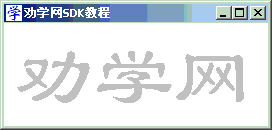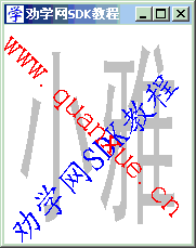 char*str1="小 雅";char*str2="劝学网SDK教程";char*str3="www.quanxue.cn";intwidth, height;switch(message) {caseWM_PAINT: RECT rc; hdc = BeginPaint(hWnd, &ps); GetClientRect(hWnd, &rc); SetBkMode(hdc, TRANSPARENT); width = (rc.right - 20) / (int)strlen(str1); height = rc.bottom - 20; hFont = SetMyFont(hdc, (LPCTSTR)"黑体", width, height, 0); //创建字体 hFontOld = (HFONT)SelectObject(hdc, hFont); //选择新字体 SetTextColor(hdc, 0xC0C0C0); TextOut(hdc, 10, 10, str1, (int)strlen(str1)); DeleteObject(hFont); //删除新字体 hFont = SetMyFont(hdc, (LPCTSTR)"楷体", 0, 32, 450); //创建字体 SelectObject(hdc, hFont); //选择新字体 SetTextColor(hdc, RGB(0, 0, 255)); TextOut(hdc, -3, rc.bottom-16, str2, (int)strlen(str2)); DeleteObject(hFont); //删除新字体 hFont = SetMyFont(hdc, (LPCTSTR)"宋体", 0, 32, -450);//创建字体 SelectObject(hdc, hFont); //选择字体 SetTextColor(hdc, RGB(255, 0, 0)); TextOut(hdc, 16, 0, str3, (int)strlen(str3)); SelectObject(hdc, hFontOld); //选择旧字体 DeleteObject(hFont); //删除新字体 EndPaint(hWnd, &ps);break;caseWM_DESTROY: PostQuitMessage(0);break;default:returnDefWindowProc(hWnd, message, wParam, lParam); }return0; } HFONT SetMyFont(HDC hdc, LPCTSTR face,intwidth,intheight,intangle) { HFONT hFont; hFont = CreateFont( height, //字体的逻辑高度 width, //逻辑平均字符宽度 angle, //与水平线的角度 0, //基线方位角度 FW_REGULAR, //字形:常规 FALSE, //字形:斜体 FALSE, //字形:下划线 FALSE, //字形:粗体 GB2312_CHARSET, //字符集 OUT_DEFAULT_PRECIS, //输出精度 CLIP_DEFAULT_PRECIS, //剪截精度 PROOF_QUALITY, //输出品质 FIXED_PITCH | FF_MODERN, //倾斜度 face //字体 );returnhFont; }
